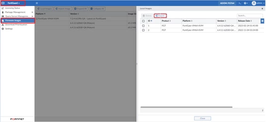 1. If FortiManager is operating in a closed network and cannot download FortiGuard images, the firmware can be manually downloaded from the Fortinet Support Portal and then uploaded into FortiManager via FortiGuard → Local Images → Import → Upload firmware.