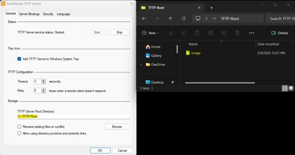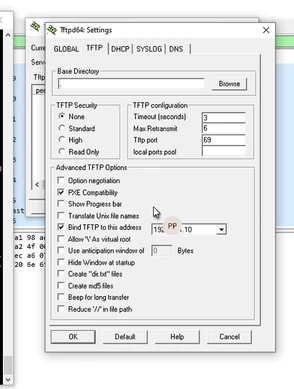 Review the TFTP server settings and make sure that the security level is set to none and the advanced TFTP options are set as follows: