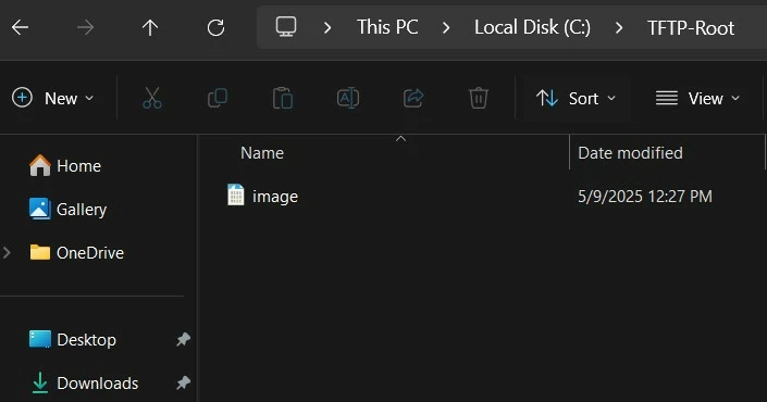 Create a directory and name it something like 'TFTP'. Move the firewall image to that directory. Rename the firmware image file to 'image' while keeping the original file extension as '.out'. The reason for renaming the image to 'image.out' is to have a much shorter file name compared with the default file name when the file is downloaded from 'support.fortinet.com'. If the file name is not changed, it can cause the TFTP file transfer to fail with the following error: