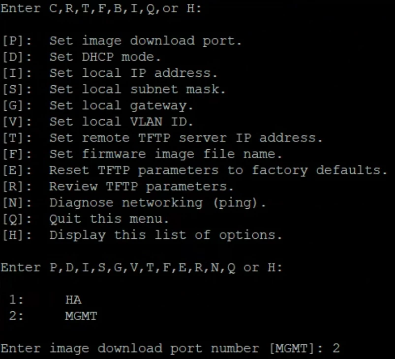 If the 'Firmware file name' is more than a certain number of characters, it will say image not found. Reduce the number of characters in the file name on the TFTP server.Once again, a list of choices with letters will appear. Press 'C' to configure TFTP parameters.