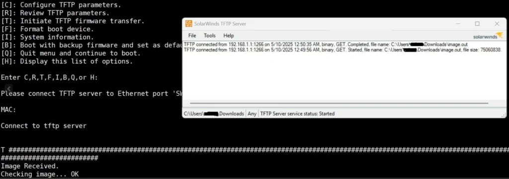 After making these changes, the transfer of the file will start successfully.After this is connected and the transfer has begun, the screen will start filling with the '#' symbol, as shown below. This means that the TFTP transfer has started successfully.