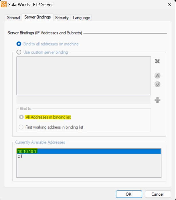 After formatting the FortiGate, it is normal for the SolarWinds TFTP Server not to display the IP address 10.10.10.1 in the binding list, as shown in the above image. This can be disregarded to