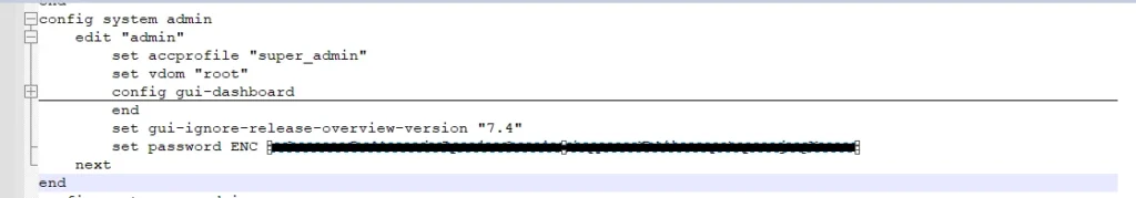 If formatting needs to be completed due to a lost admin password and an existing backup configuration has to be re-imported, make sure that the password configuration line has been removed from it, as shown in the screenshots below:Edit the backup config text file with a text editor such as Notepad++, delete the 'set password' line from the configuration, and save the file as a new file with a .conf extension.