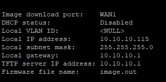 DHCP status: Disabled Local VLAN ID: <NULL> Local IP address: 10.10.10.115 <----- FortiGate IP address. Local subnet mask: 255.255.255.0 Local gateway: 10.10.10.1 <----- Host IP address. TFTP server IP address: 10.10.10.1 <----- Host IP address running the TFTP