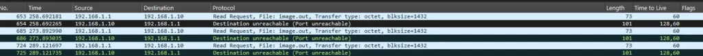 At times, the file transfer might not yield any errors or indicate that a connection to the TFTP server is being initiated, and it may appear to be stalled, as illustrated below:Please connect TFTP server to Ethernet port 'WAN1'.MAC: 94:ff:3c:6e:e9:66Gathering a Wireshark capture on the interface linked to the TFTP server would reveal that the destination port is unreachable, as demonstrated in the capture below: