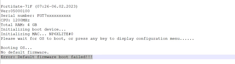 FortiGate-81E (12:47-03.03.2017) Ver:05000007 Serial number: FGT81E*********1 CPU: 1000MHz Total RAM: 2 GB Initializing boot device... Initializing MAC... nplite#0 Please wait for OS to boot, or press any key to display the configuration menu.