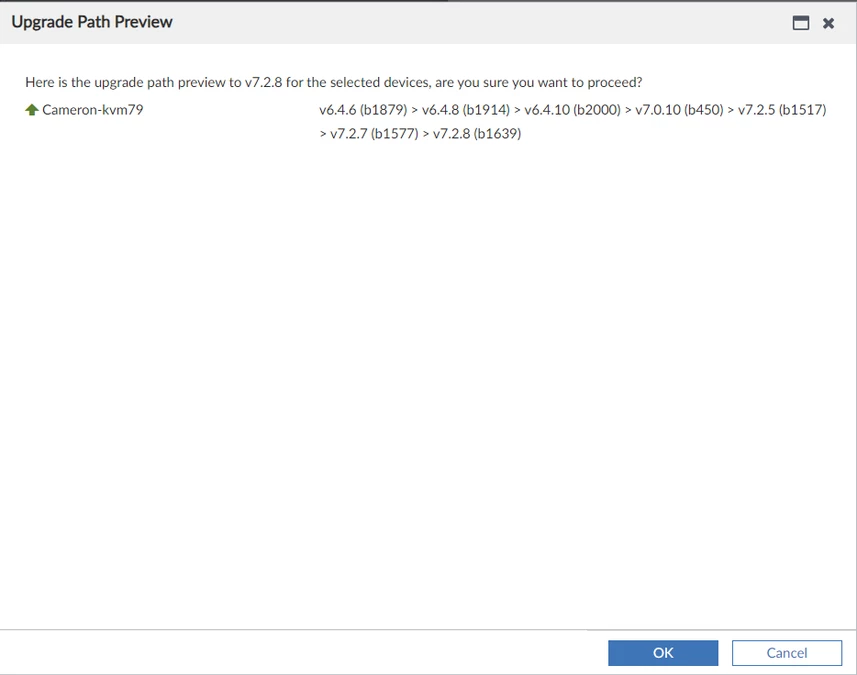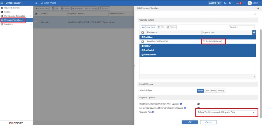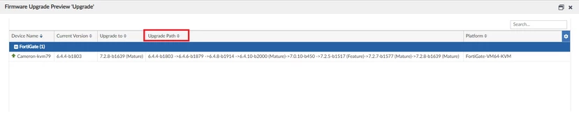 Once the FortiGate has been assigned to the firmware template, 'right-click' on the template, select 'Upgrade Preview' and check the Upgrade Path.