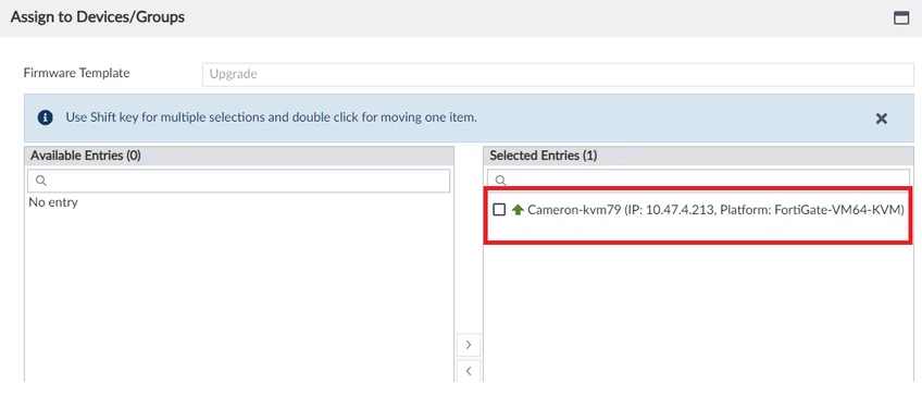 After the firmware template is created in FortiManager, right-click the template, select “Assign to Device/Group”, and assign the required FortiGate device or group.