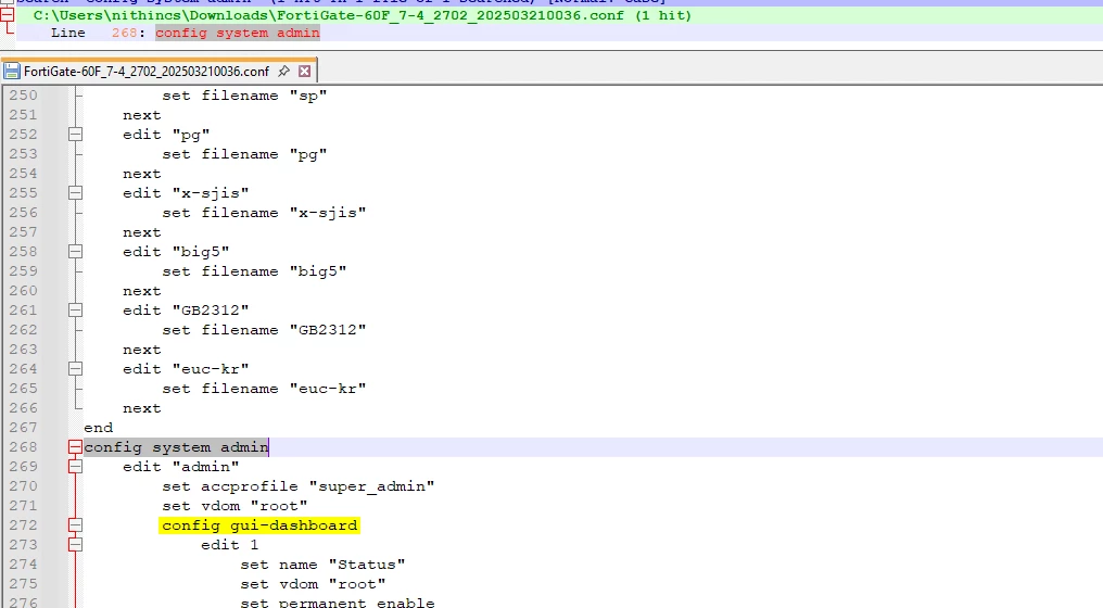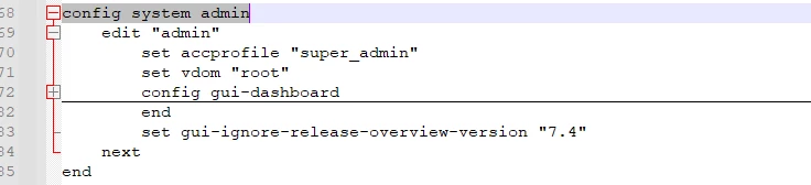 Search for 'config system admin' and select the '-' symbol in the 'config gui-dashboard' line to collapse the gui-dashboard configuration.