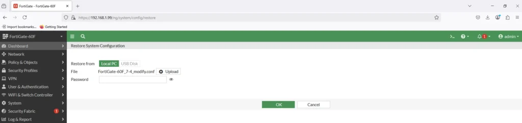To log in I use the default username which's admin. There is no password.Next I will upload the modified configuration file to the FortiGate device. here